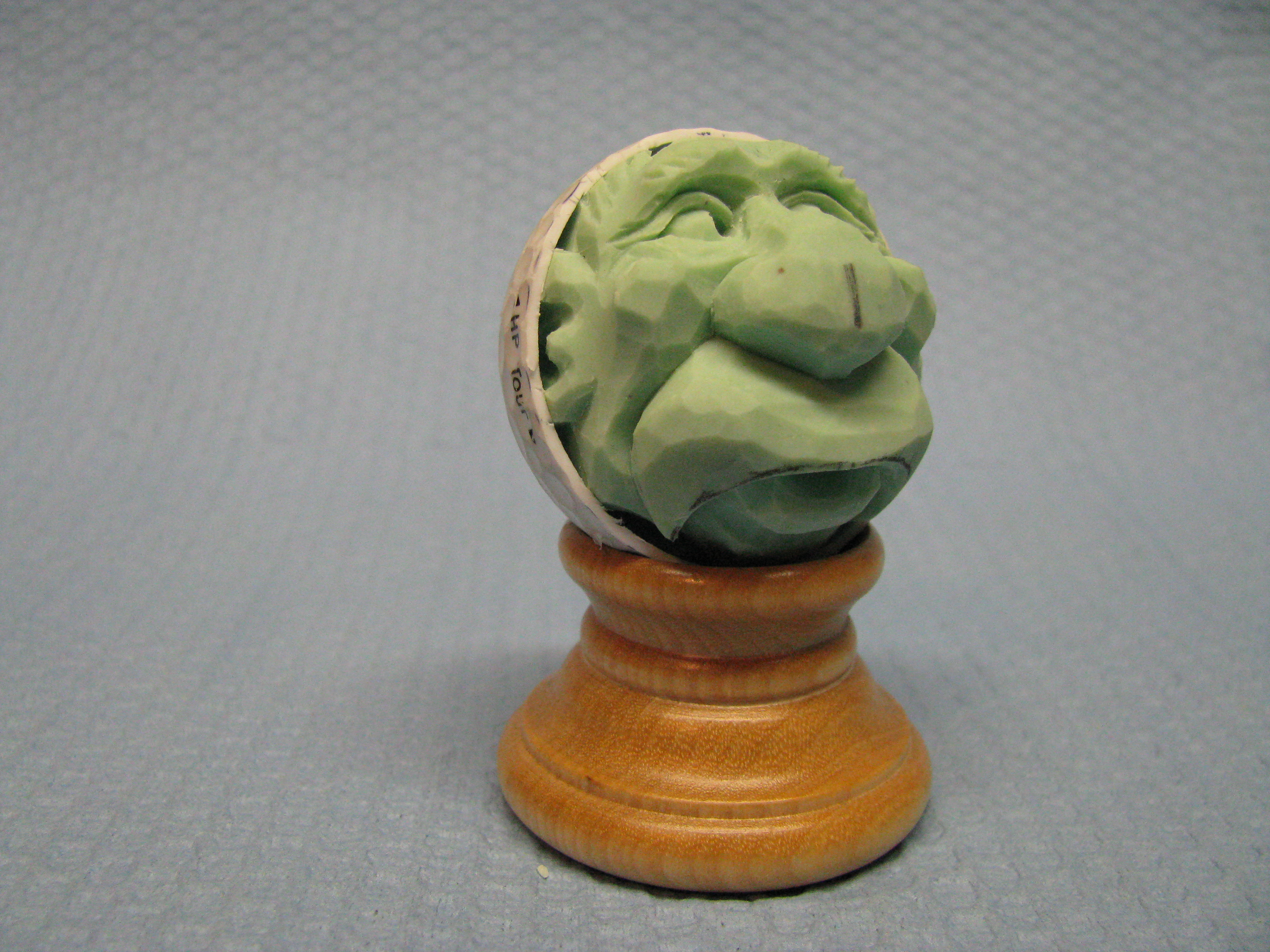 I use a carving glove that has rubber dots which ensure a good grip on the ball. I used a carving knife with a straight cutting edge. #11-9mm and 7mm gouges. A #5-7mm gouge. #9-3mm and 6mm gouges. A #3-2mm shallow gouge. A 3mm V-Tool.