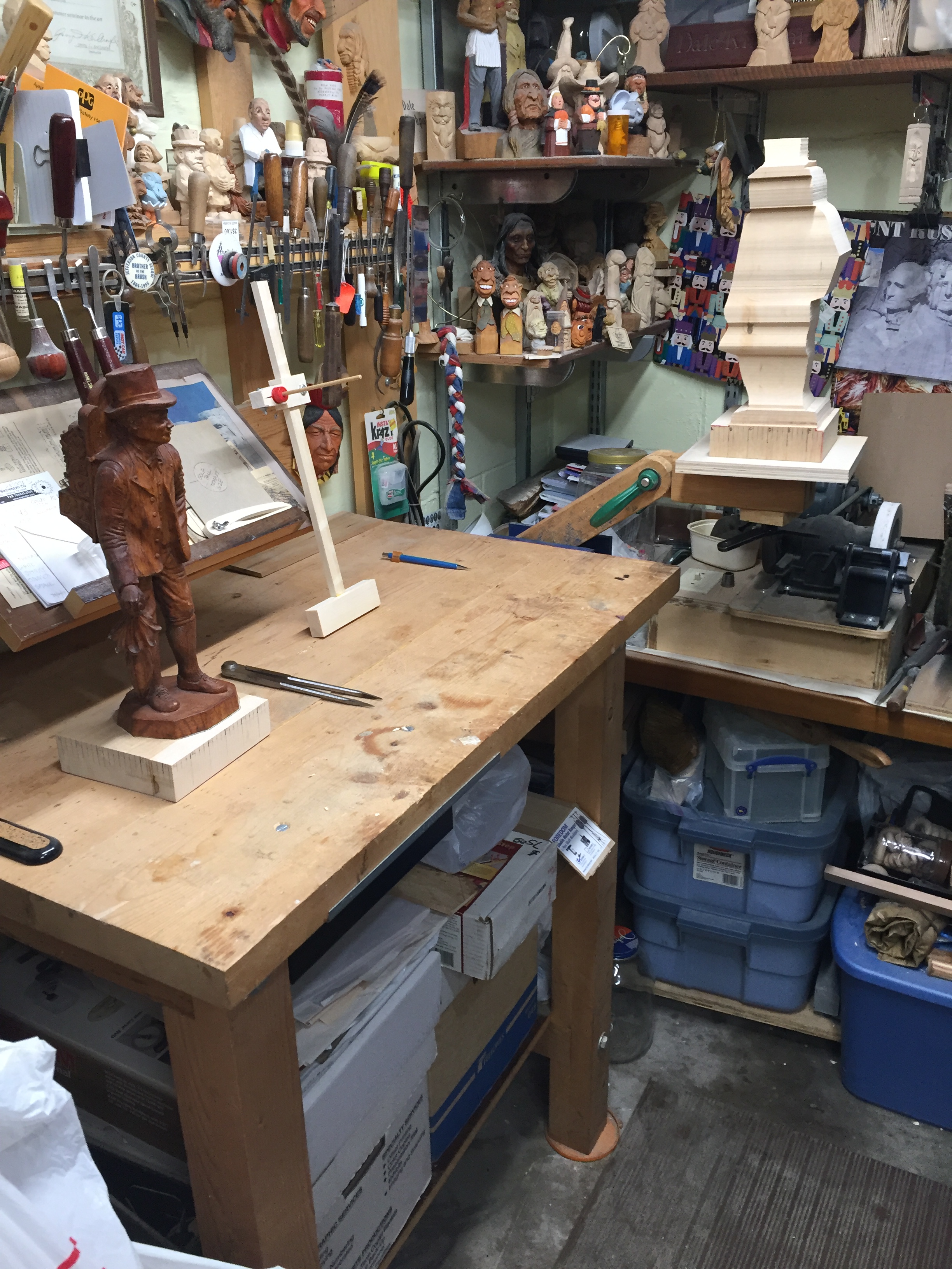 Carving bench with blank attached to carving arm. Published September 18, 2018 at 2448 × 3264 in Clock Peddler Project, Part 1 ← Previous Next →