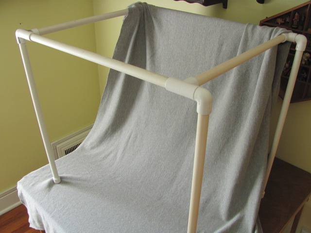 I place the tent on a card table because it’s a good height for me. I have a large piece of fabric that’s gray and feels like material used to make “T” shirts. I drape this over the back pipe of the frame so it forms a smooth curve out to the front legs. The color is important so you have a neutral background.