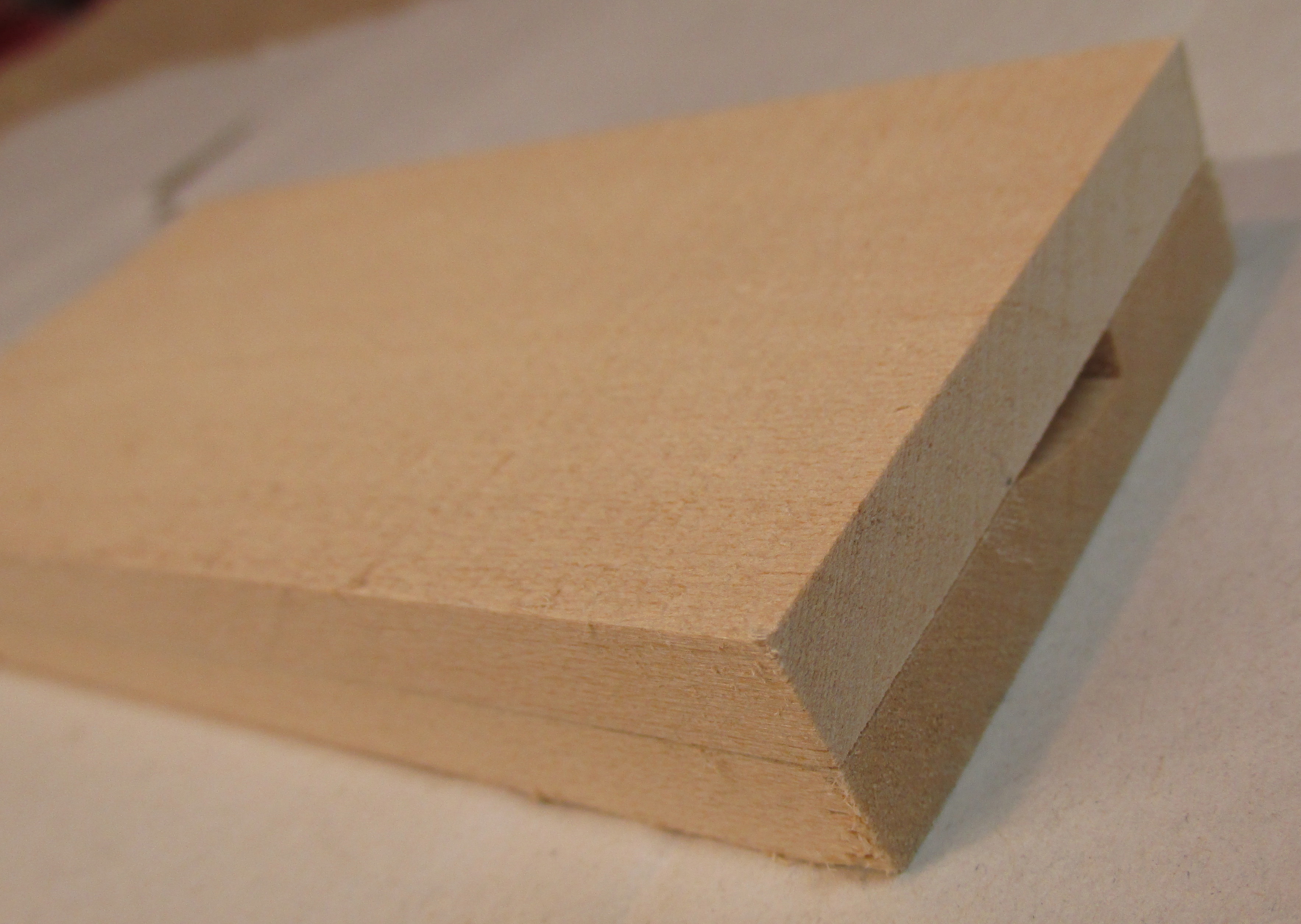 I started with two scraps of basswood 2 1/4 by 5 3/4 inches (58mm by 122mm). The pieces were about 3/8 inches (9mm) thick. Because the blade was extra large, the wood was large, too. I added the extra inches to the length to allow more room for creativity. The surfaces that will be glued should be smooth and flat so no gaps occur.