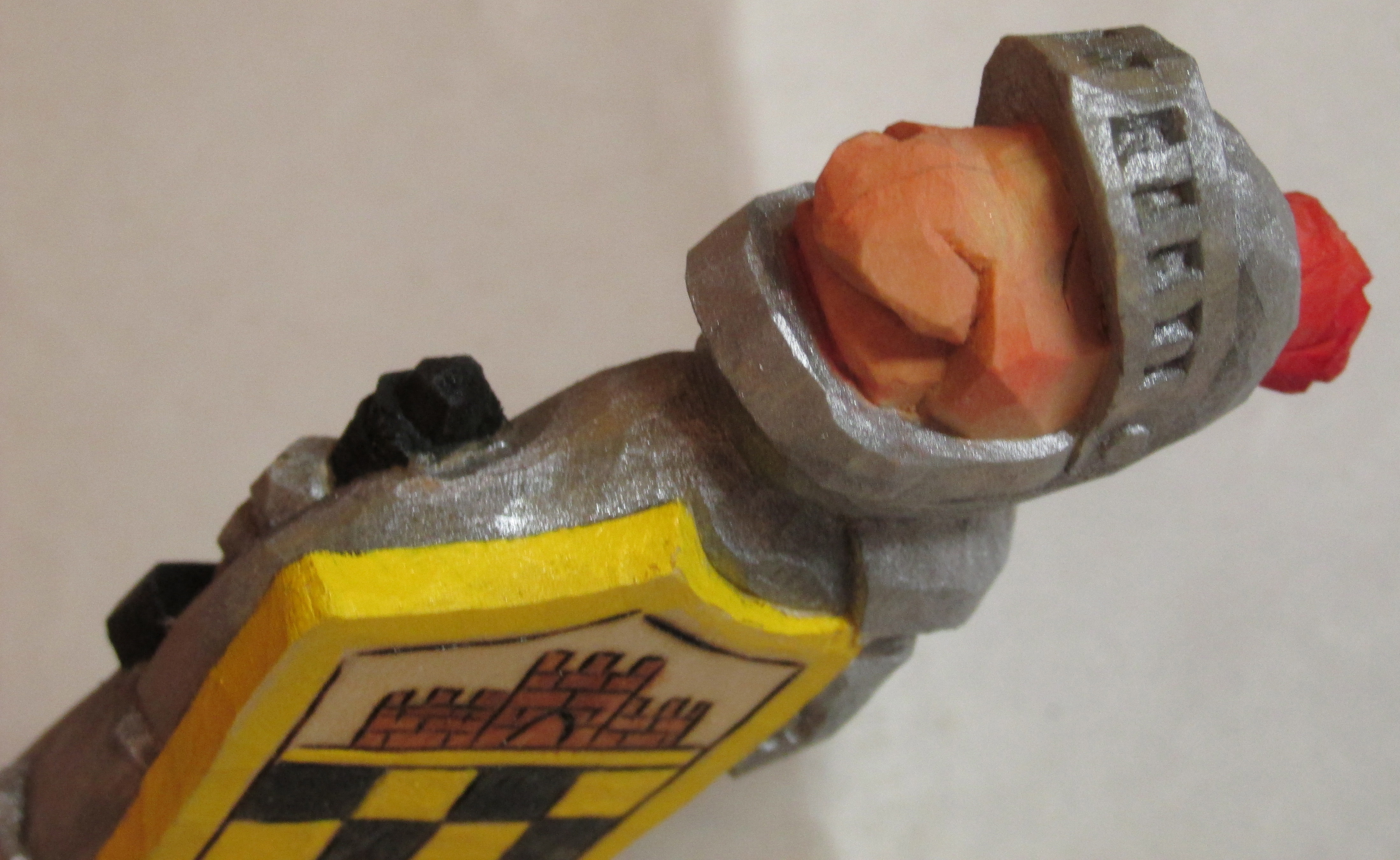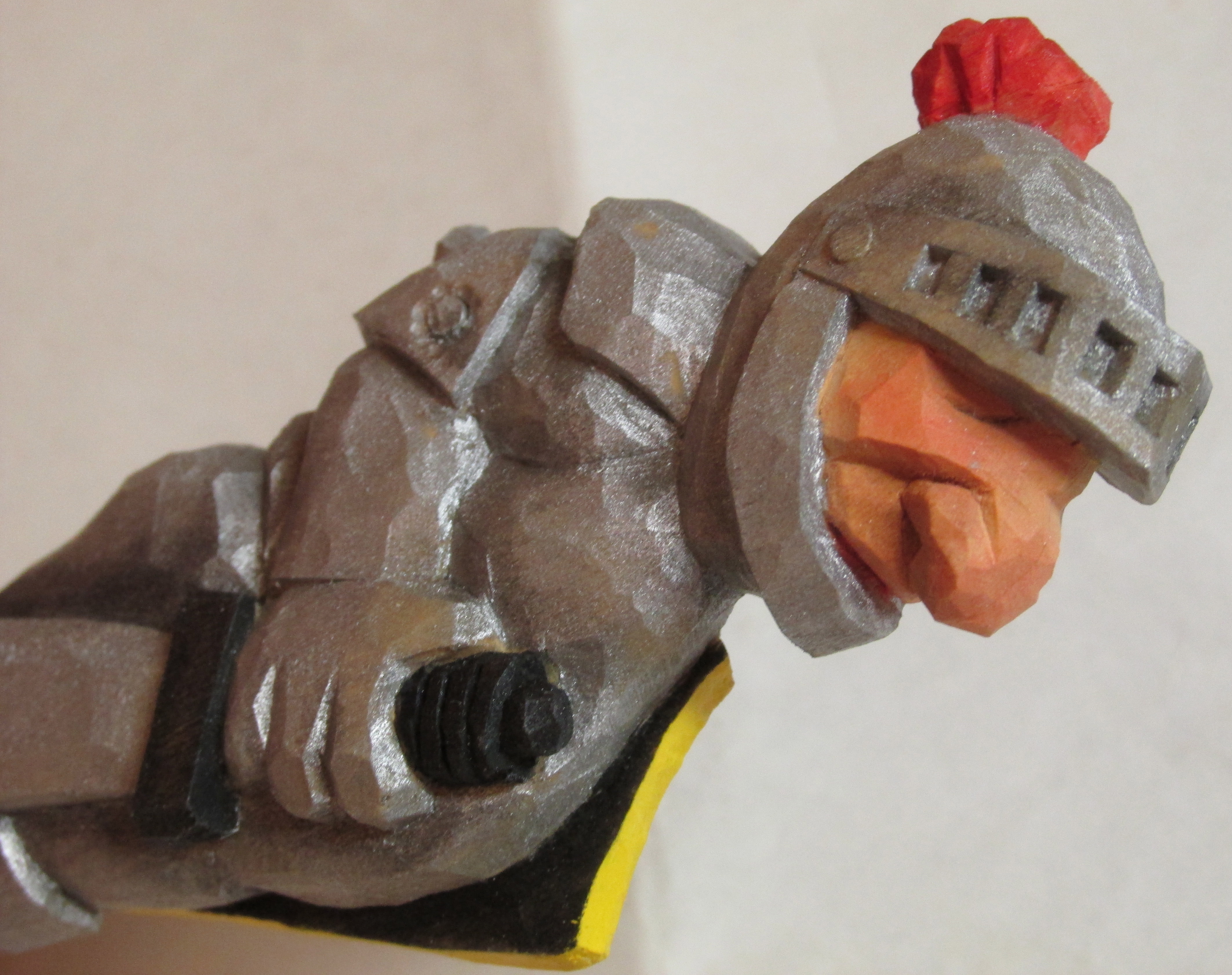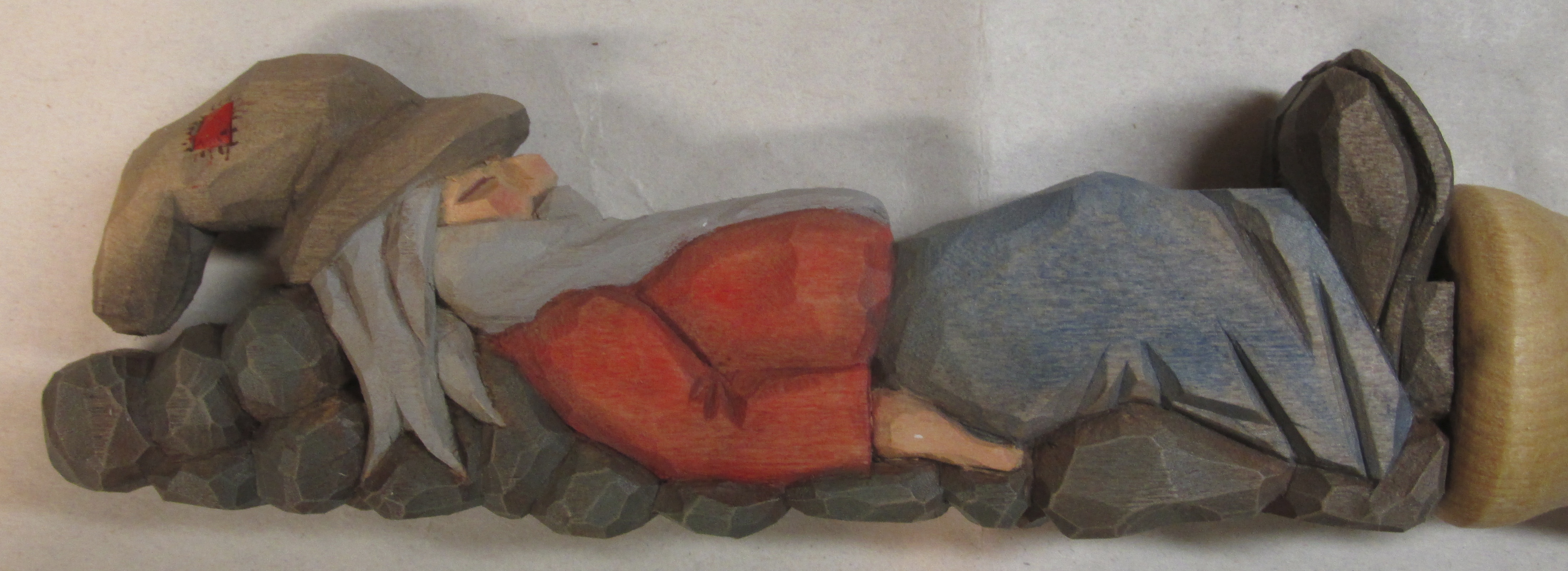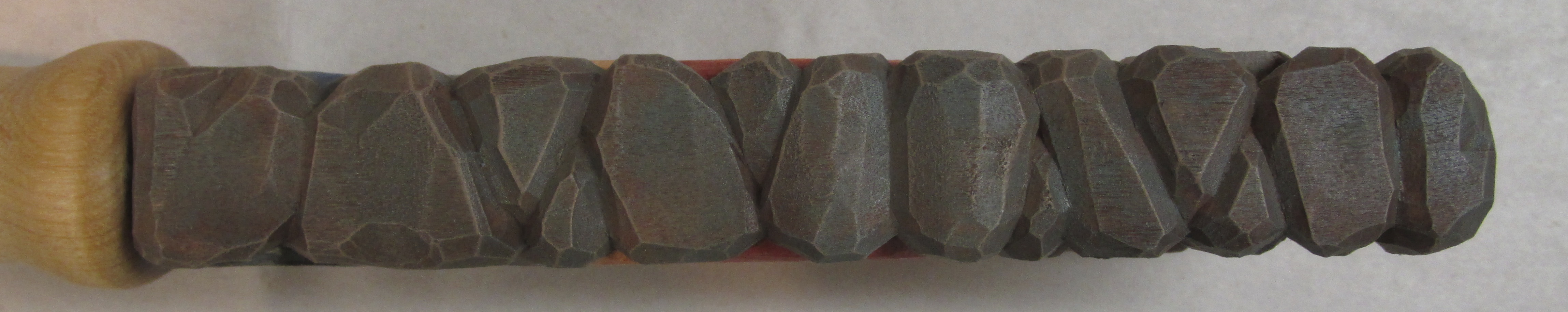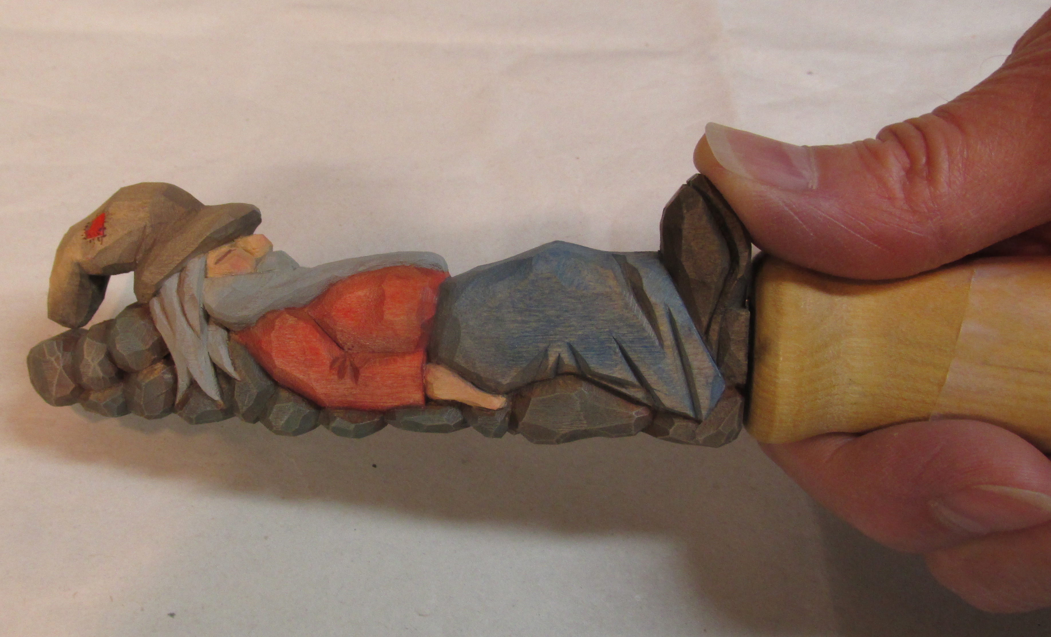 I’ll point out a couple of design considerations I used for my cover. I wanted a “push point” in my design so it was more natural to hold the knife with the sharp edge downward and the thumb could push the cover to loosen it. I created this with the boot on the figure. Of course the obvious position of the figure suggests the sharp edge is toward it’s bottom. The other precaution I took was to protect the hat on the figure. Because of it’s shape, and it’s location at the end of the cover, I wanted to add some protection. I used the extra length of the wood to carve some stones that would more than likely receive the impact from a fall.