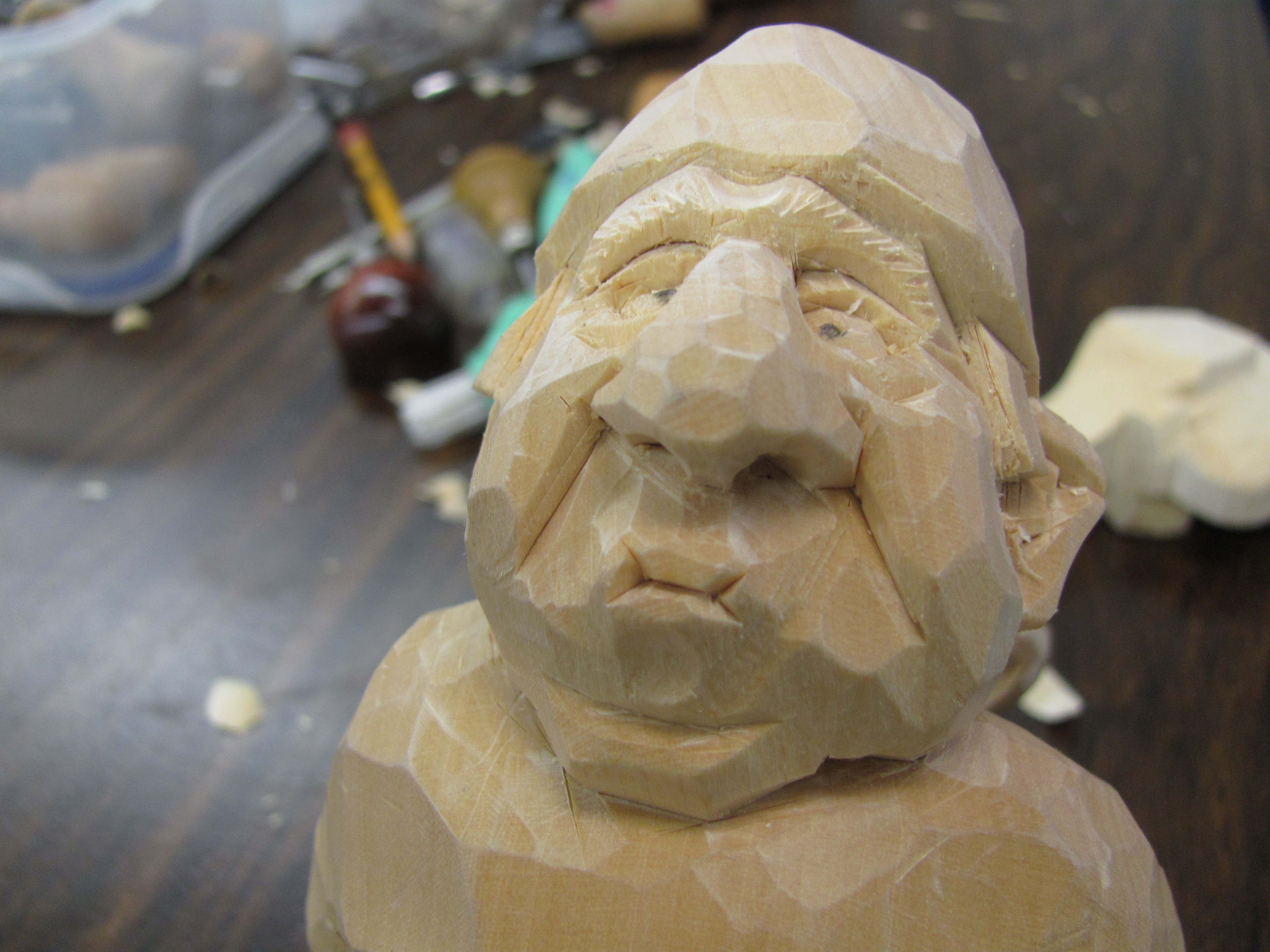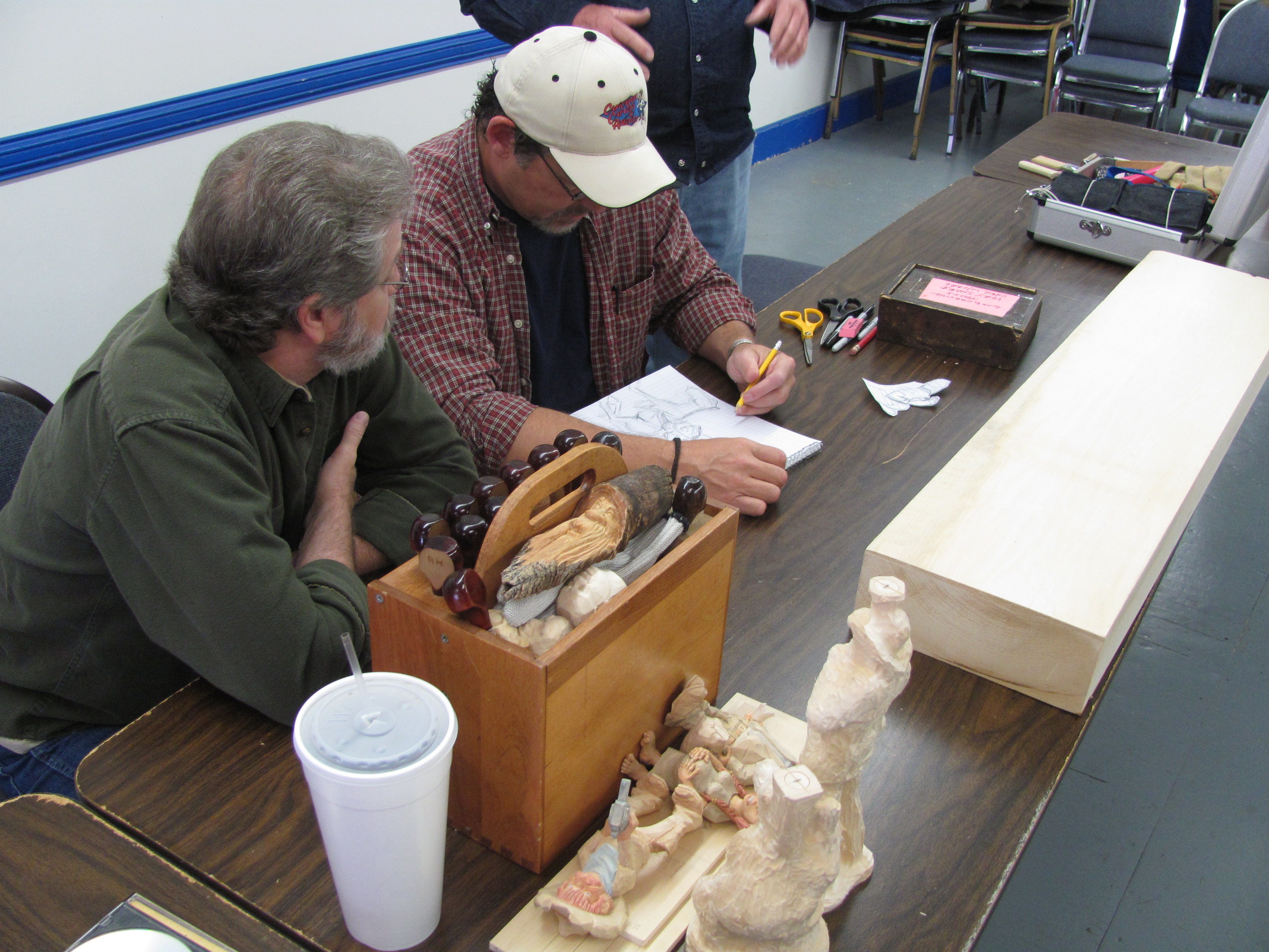Progress by lunch time first day. Some of our projects were multiple figures and some had the heads carved separately. As the additional pieces were needed, Chris would assist with another sketch and the process would repeat.