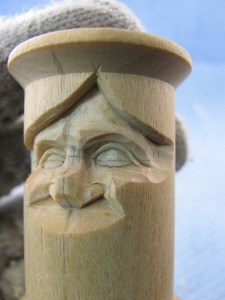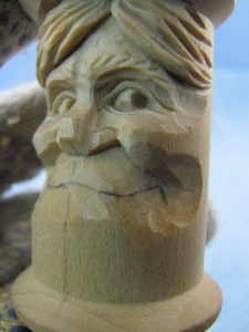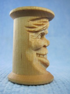 Spools come in many sizes and shapes. The one I used for this project is 2 1/8 inches tall and 1 3/16 in diameter. Try to find one a couple of inches tall for your first attempt unless you’re also a watchmaker. The shape may offer special challenges to your creativity. Some spools have a thin waist to allow for more thread. Some are shaped like a barrel. Some are only a half inch tall. My goal is to make the spool into a head rather than a relief carving of a face. There’s more wood available than you think so go deep. Of course a cylinder of wood is just a cylinder and not the proportion of a skull and neck. Space is limited and ears end up close to the eyes or the hair takes up the space for the ear. On most of mine, the edges of the carving just blend into the rest of the spool. Due to poor planning, I sometimes run out of space to develop a chin. Except for long whiskers, walking stick faces can be carved into spools.